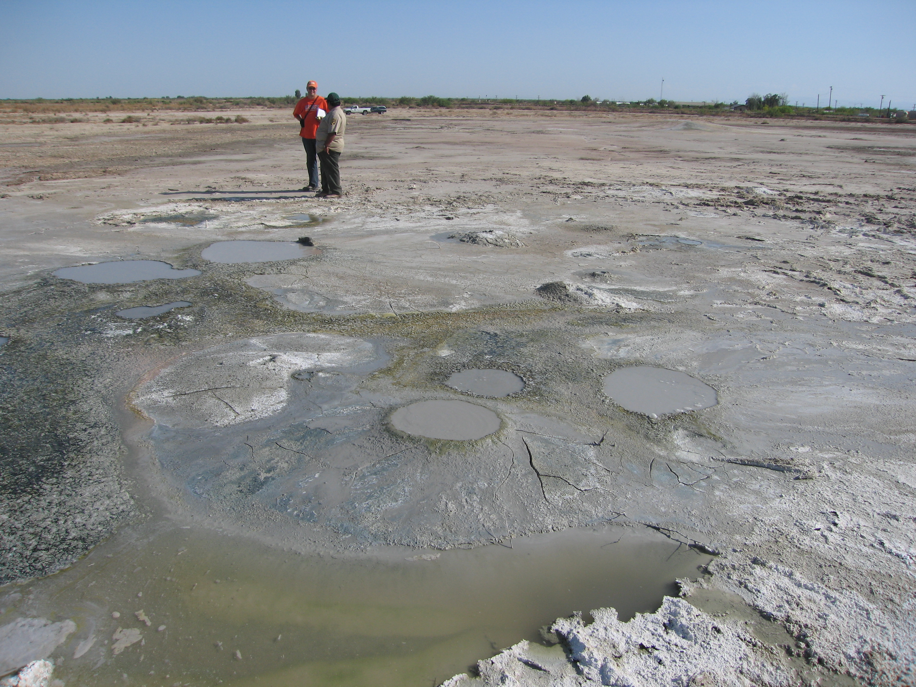 Dr. Kenneth Hudnut and Adolfo Hernandez in a field of mud pots and mud volcanoes.